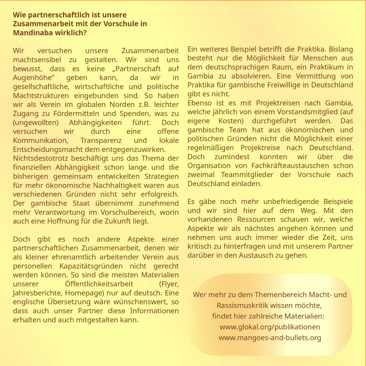 Durch die vielen Jahre der Zusammenarbeit ist eine vertrauensvolle partnerschaftliche Zusammenarbeit mit den Angestellten, insbesondere dem Direktor der Vorschule in Mandinaba / The Gambia entstanden.